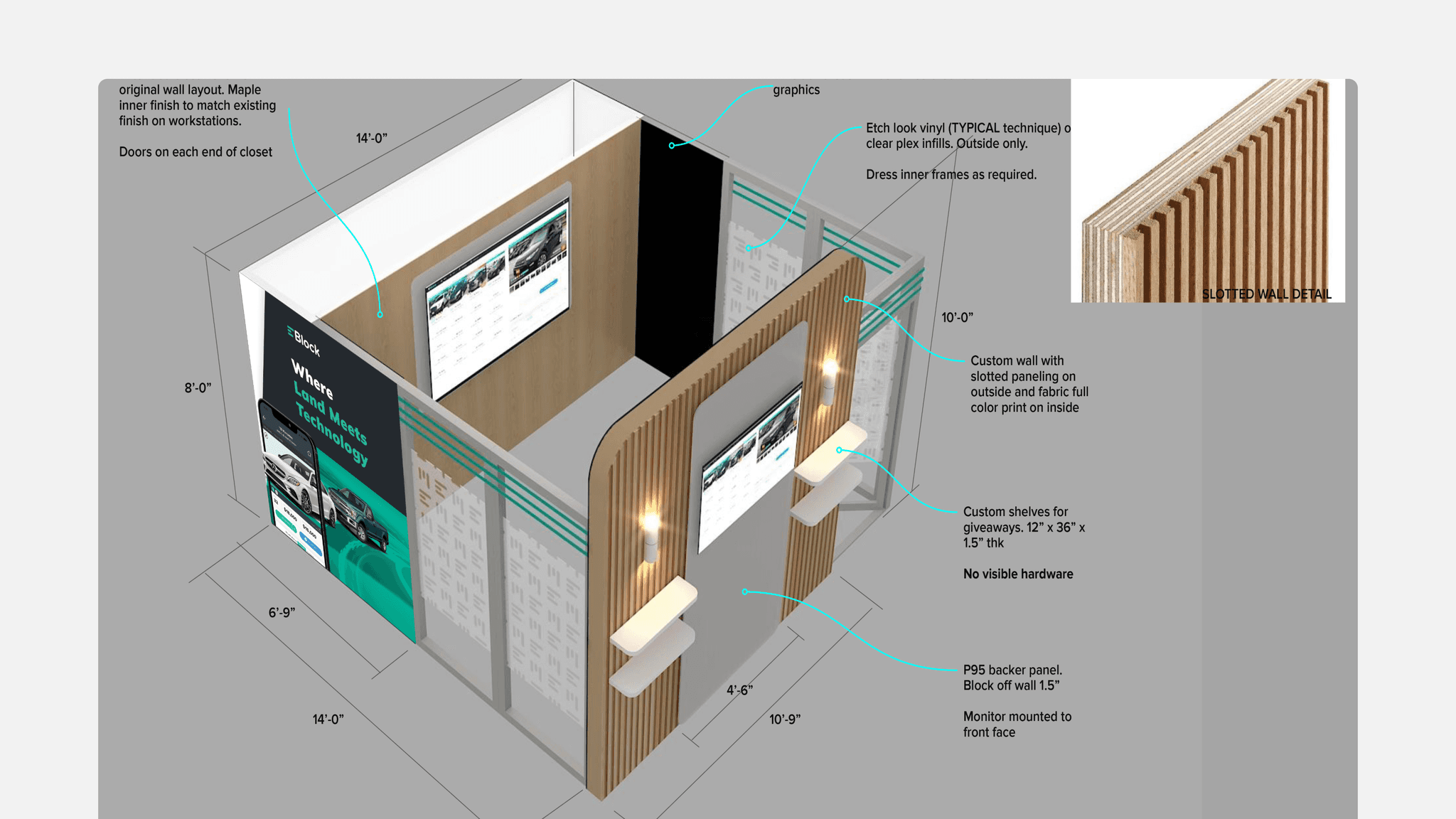 Trade show environments are often loud, making audio narration ineffective. To overcome this, I focused on using bold, concise key phrases to communicate EBlock’s standout features. The visuals and text were carefully designed to grab attention, hold interest, and deliver a clear message, even without sound.