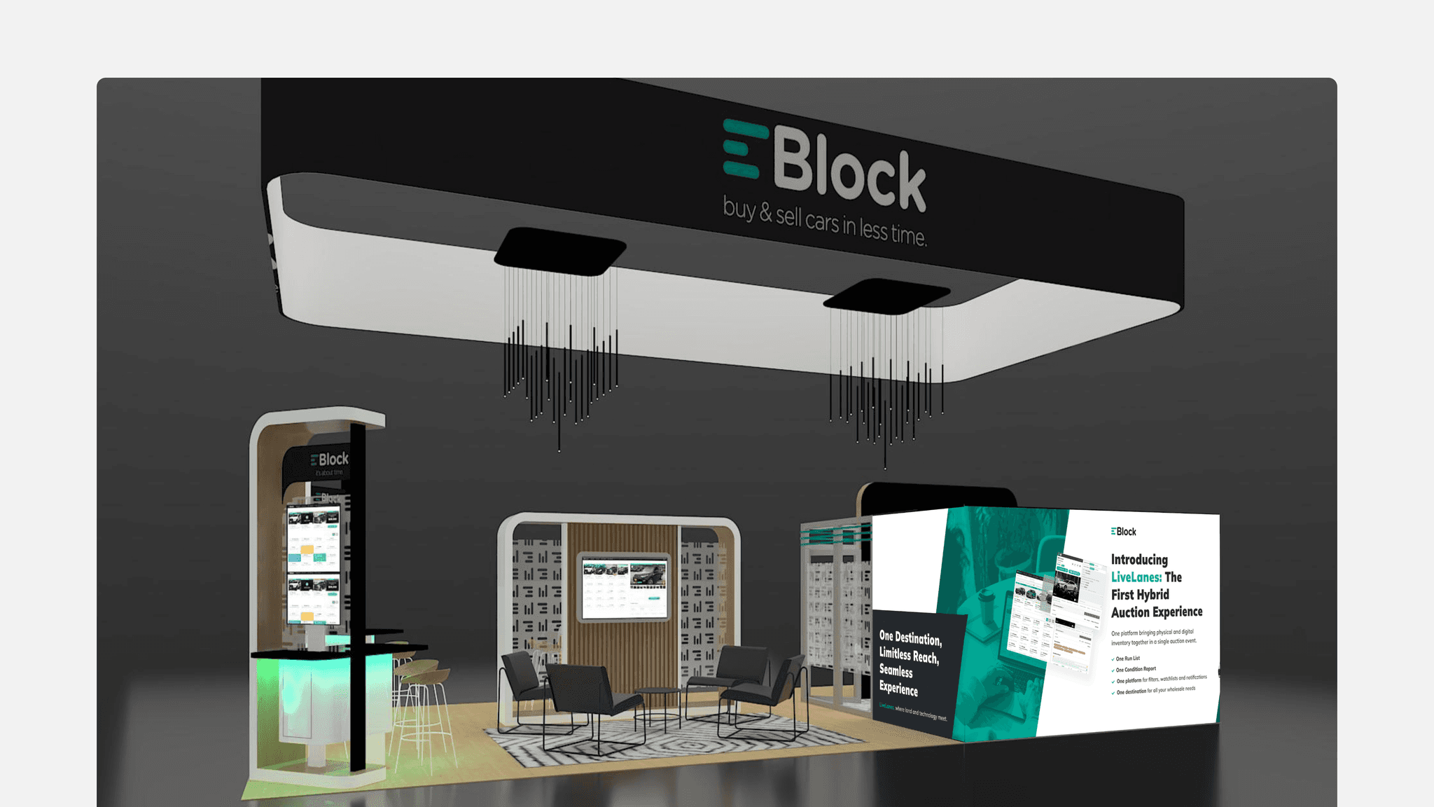 Virtual mockup of our booth at the NADA Show, showcasing cohesive branding and bold imagery.