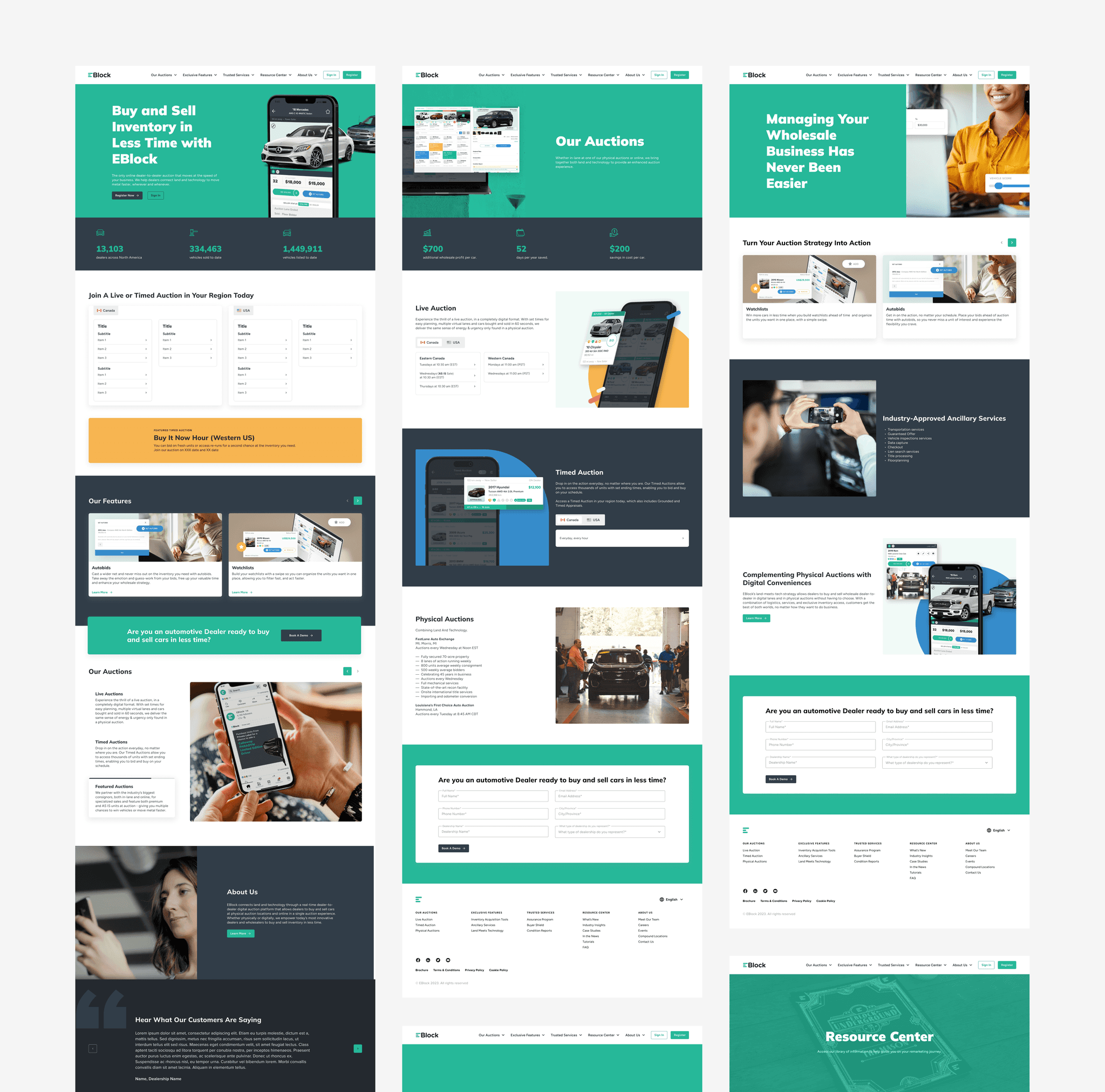 High fidelity wireframes of the home page, auctions page, and resource center.