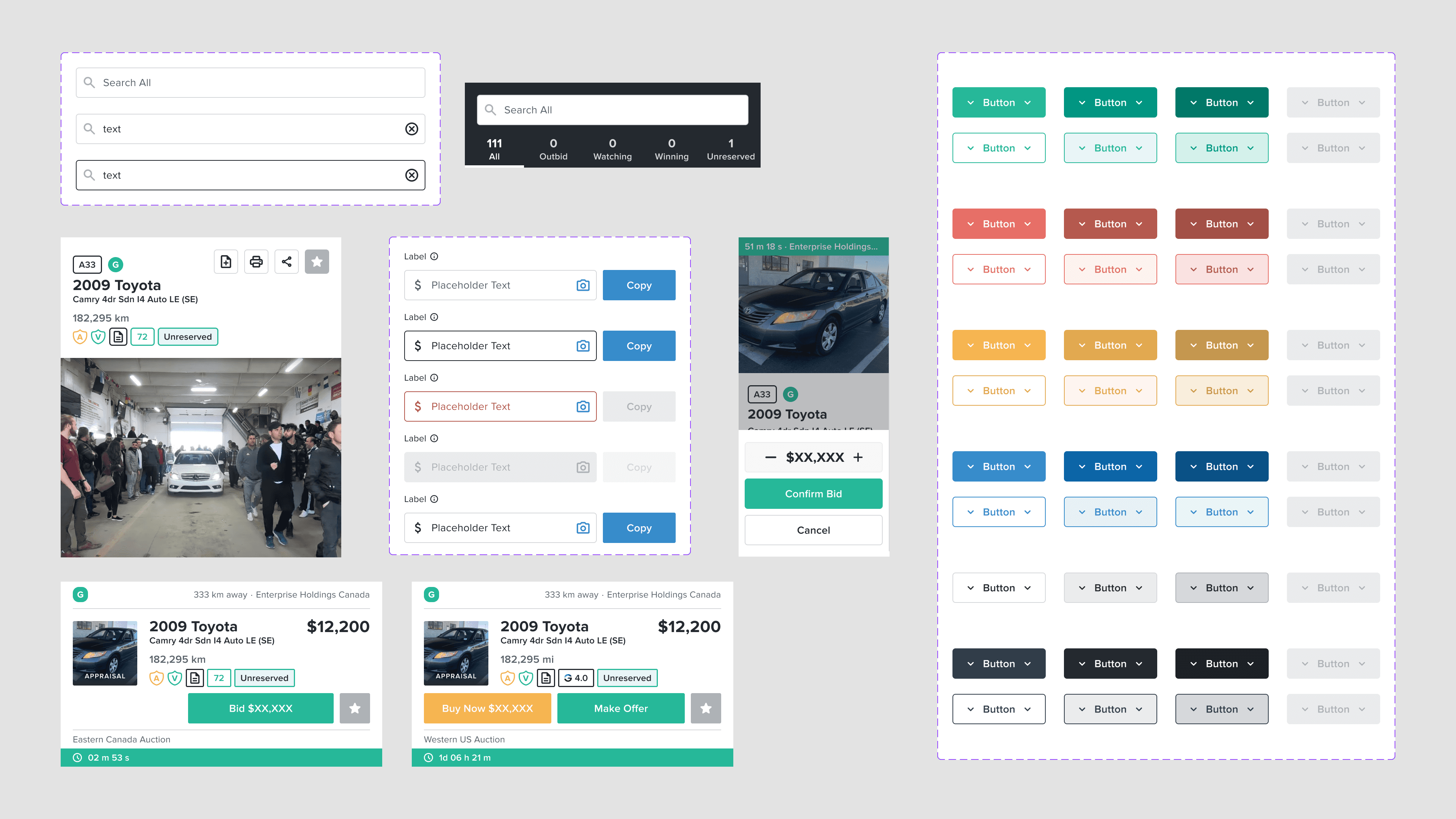 Organisms: Complex components like vehicle cards and auction control panels
