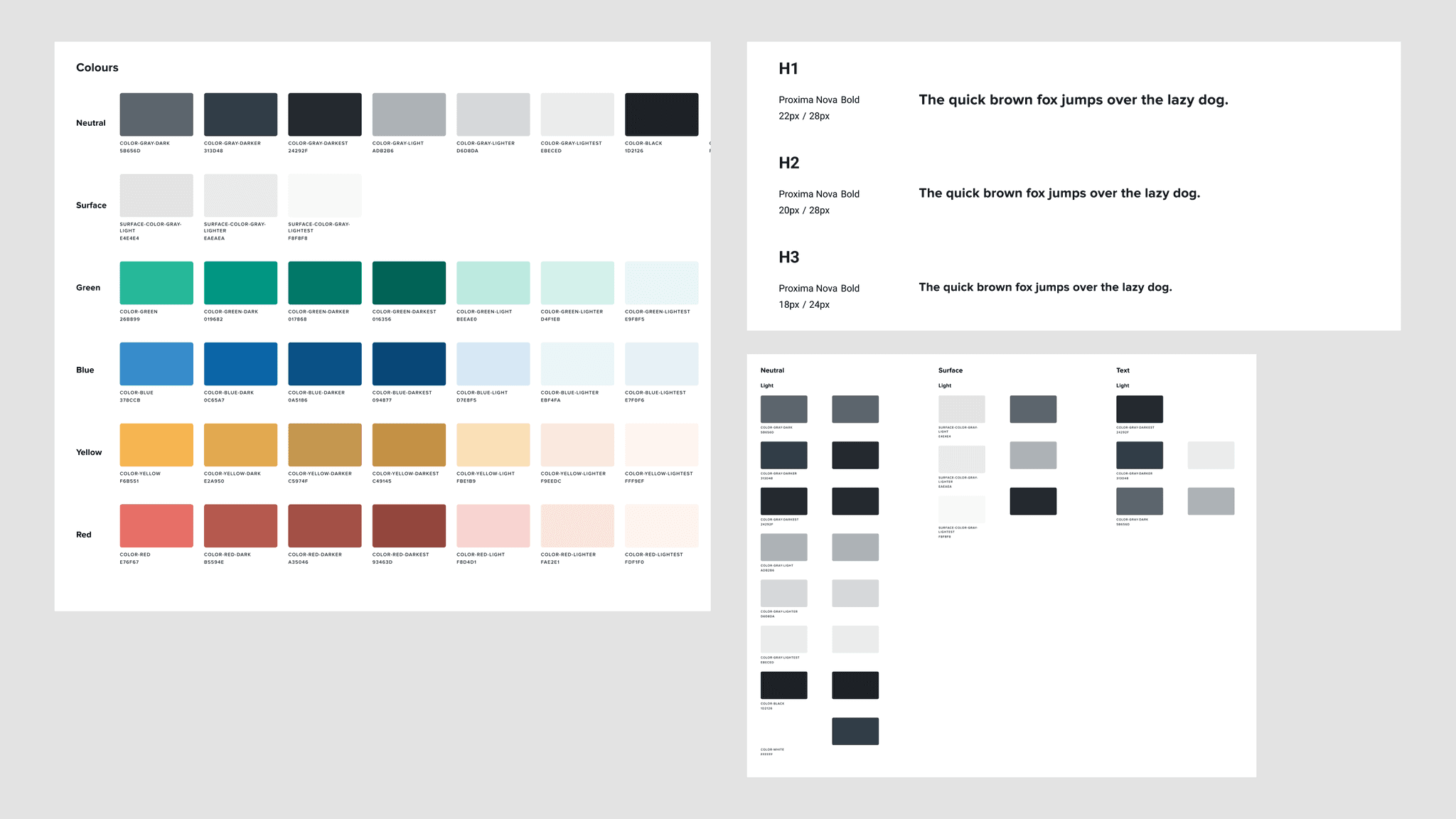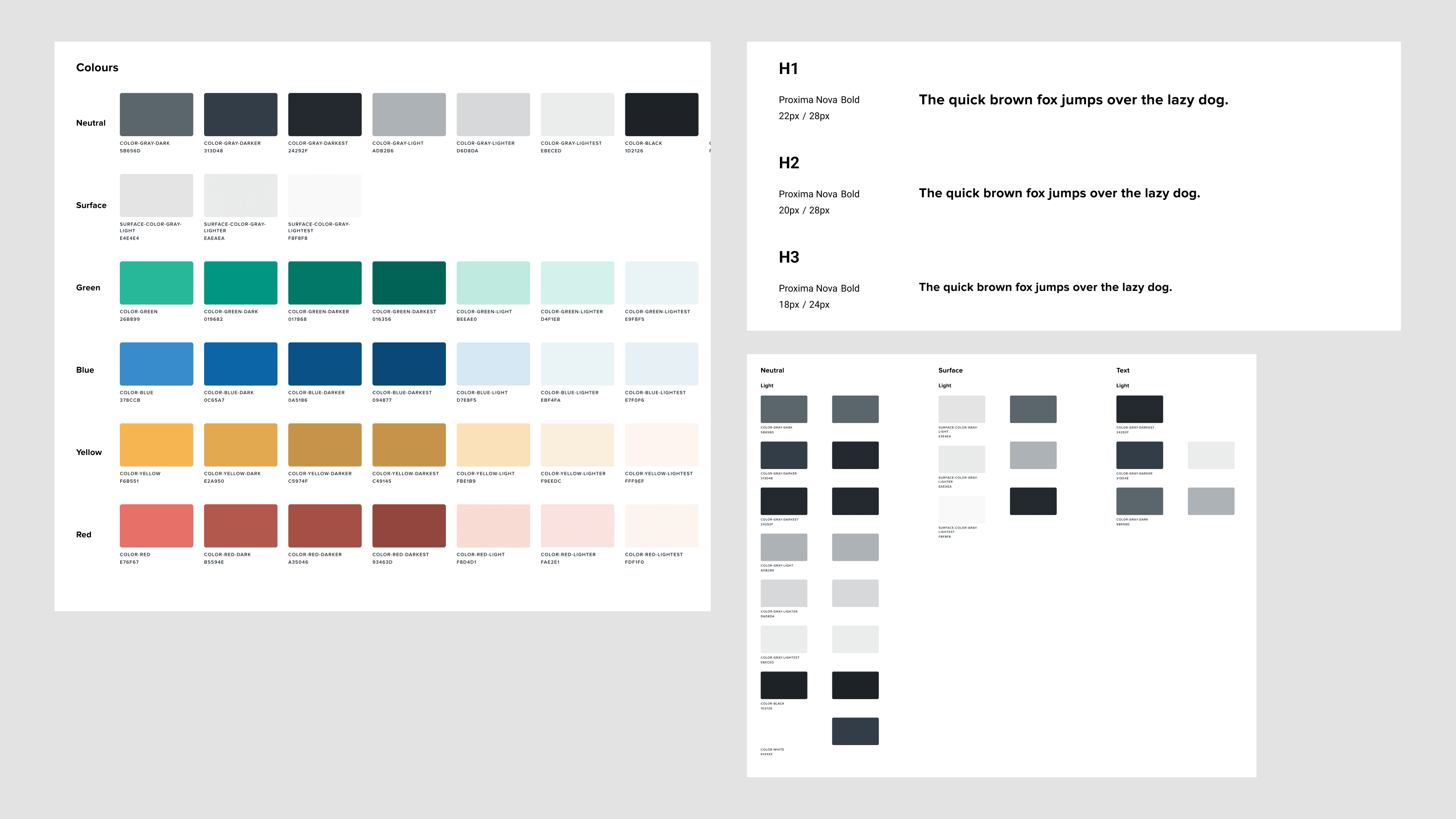 Examples of our color palette (including light and dark mode) and typography.