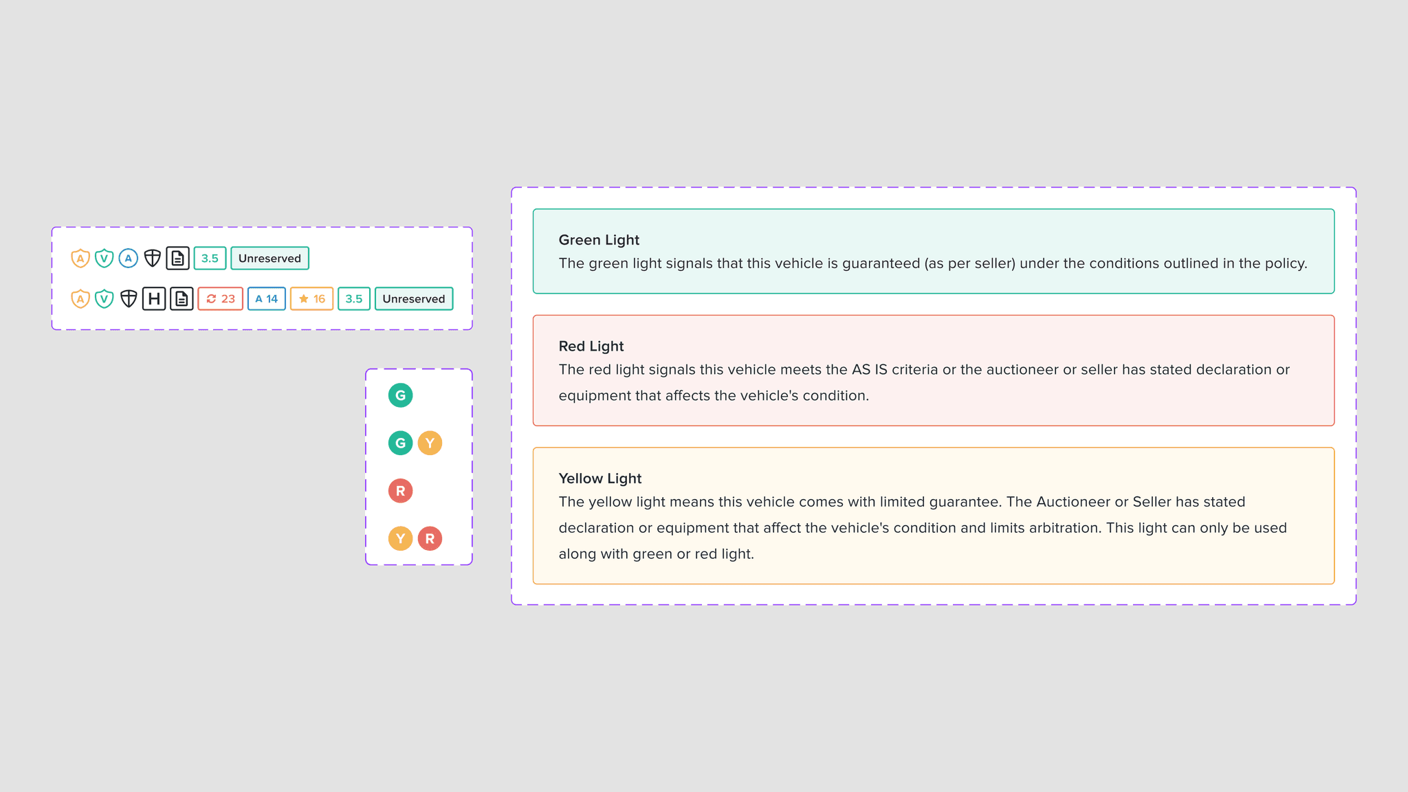 Physical auto auctions universally use color-coded sale lights (Green=Good, Yellow=Caution, Red=Issues) as the standard communication method with decades of established meaning.