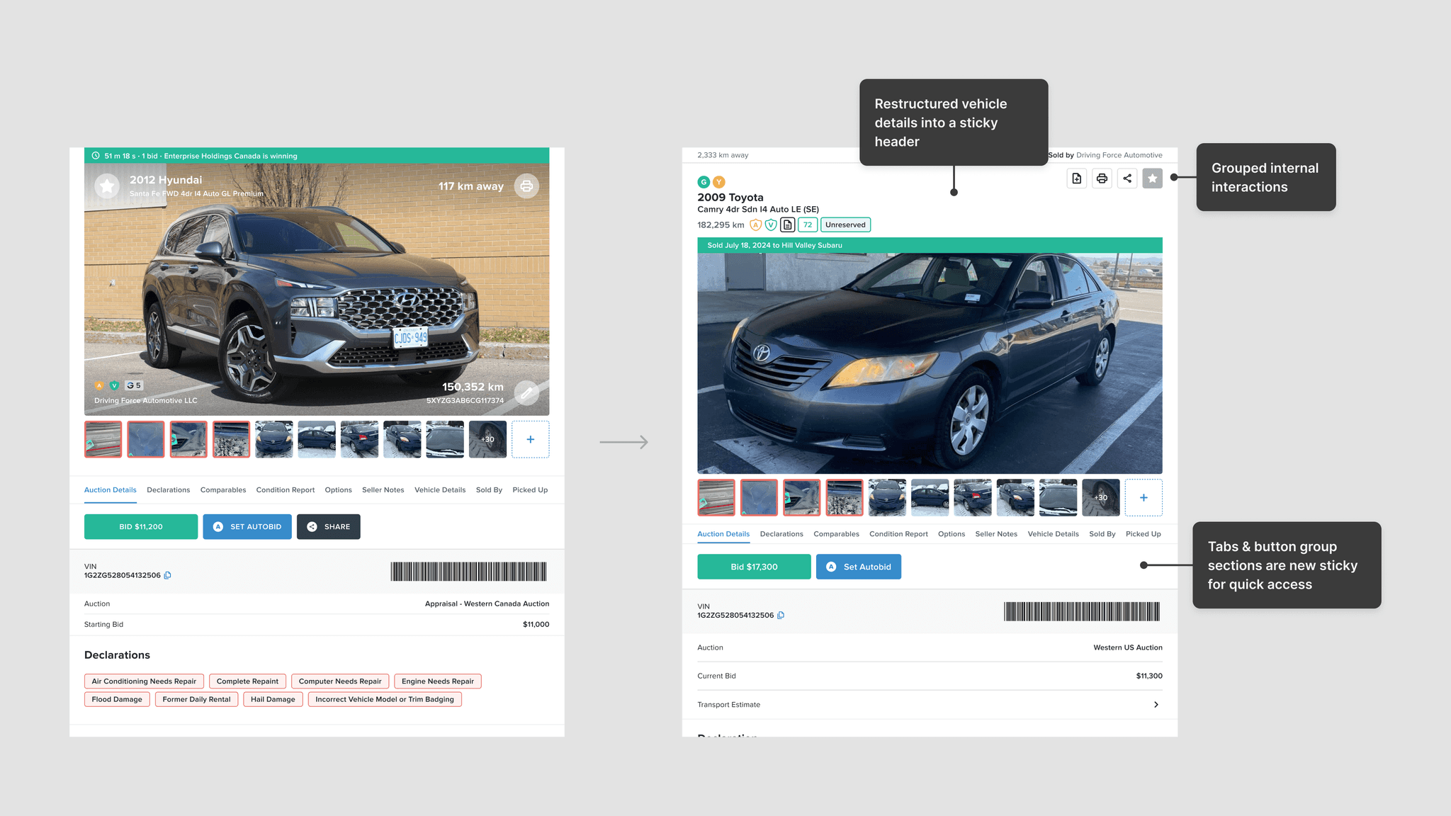 Vehicle Detail Pages: Sticky header ensuring condition visibility during scrolling