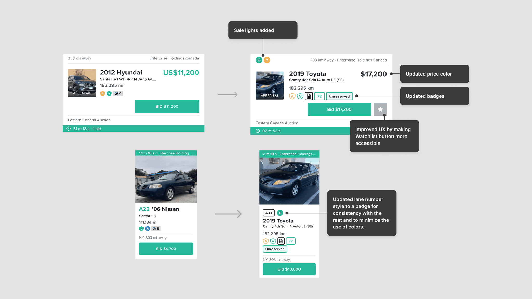 Vehicle cards: Prominent sale light placement with supporting badge information